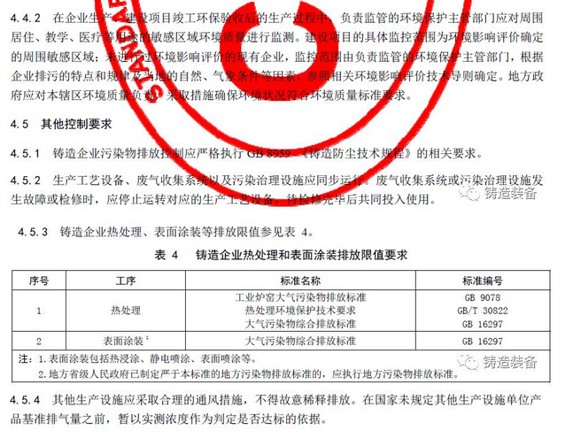 現(xiàn)摘錄T/CFA030802-2—2017中“4排放控制要求”、“5污染物監(jiān)測(cè)要求”、“6實(shí)施與監(jiān)督”部分。前三部分“1范圍、2規(guī)范性引用文件、3術(shù)語(yǔ)與定義”請(qǐng)自行登錄中國(guó)鑄造協(xié)會(huì)網(wǎng)站查閱。