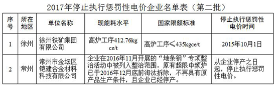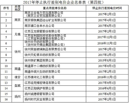 根據省經信委、省物價局《關于原能耗超限額和使用淘汰設備的企業申請停止執行懲罰性電價有關問題的通知》(蘇經信節能〔2010〕935號)要求及省節能監察中心《2017年第三批使用淘汰設備及超限額使用能源企業整改的復查報告》(蘇節能監察〔2017〕4號),經省節能監察中心現場監察和審核有關材料,現研究決定對南京立業電力變壓器有限公司等16家企業停止執行差別電價、對徐州鐵礦集團有限公司等2家企業停止執行懲罰性電價(詳見附件)。