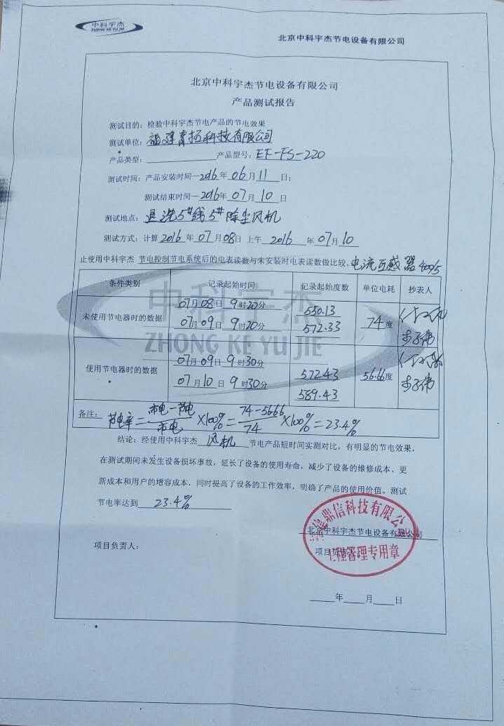 設(shè)備安裝后,經(jīng)過嚴(yán)格的檢驗測試,對比安裝前后的實際能耗情況來看,顯示節(jié)能率達(dá)到23.4%,達(dá)到了預(yù)期的節(jié)電效果。此項節(jié)能項目改造,給用能企業(yè)帶了直接的經(jīng)濟(jì)效益。按保質(zhì)十五年計算,此次節(jié)能改造能為用能企業(yè)帶來五百三十三萬人民幣以上直接經(jīng)濟(jì)效益。